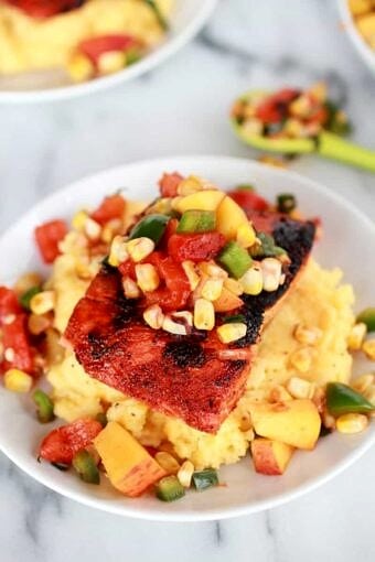 Save RecipeMain CourseJune 19, 2013Blackened Salmon with Cheesy Polenta and Spicy Peach + Chard Corn Salsa