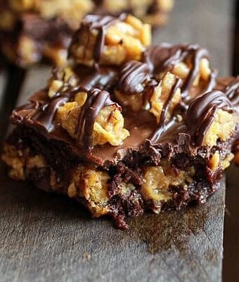 Save RecipeDessertsAugust 30, 2013Chewy Chocolate Drenched Peanut Butter Cornflake Crunch Fudge Brownies