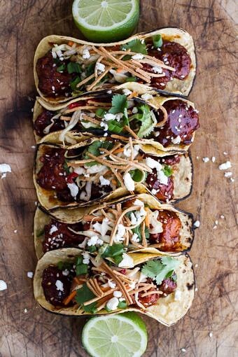 Save RecipeMain CourseApril 9, 2014Korean Fried Chicken Tacos with Sweet Slaw, Crunchy Noodles + Queso Fresco.