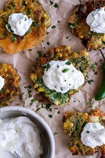 Save RecipeMain CourseMay 5, 2014Spinach and Artichoke Corn Fritters with Brie and Sweet Honey Jalapeรฑo Cream.