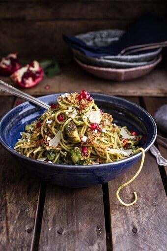 Save RecipeMain CourseNovember 17, 2014Manchego Brussels Sprout + Prosciutto Spaghetti w/Brown Butter Pistachio Pangrattato.