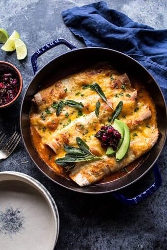 Save RecipeMain CourseNovember 8, 2015Green Chile Butternut Squash and Turkey Enchiladas with Crispy Sage.