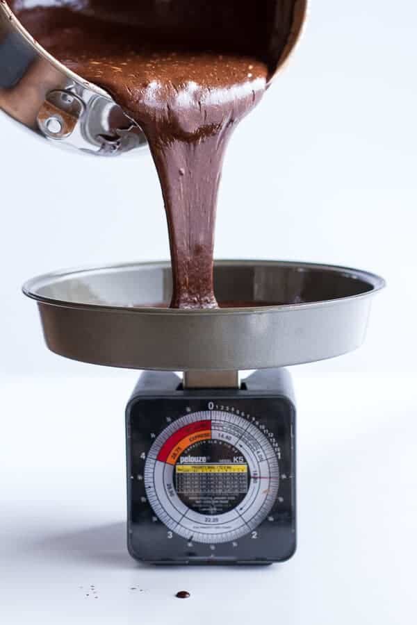 • Pour the batter among the 3 cake pans and bake 20 to 25 minutes, until the tops are just set and no longer wiggly in the center. Remove and let cool five minutes, then run a knife around the edges of the pan. Grab 2 large flat plates, line them with wax or parchment paper and invert the cakes onto the paper lined plates. Cover and let the cakes cool completely before slicing + frosting.
