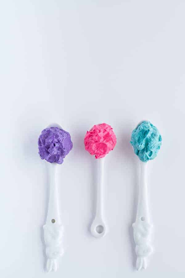 • If coloring your frosting, add 1 1/2 cups of frosting to 2 individual bowls and then 3/4 cup frosting to another bowl. Add your desired colors and mix well. The bowls with 1 1/2 cups frosting will be the two bottom and the two top layers of the cake. The bowl with 3/4 cup frosting will be the middle layer