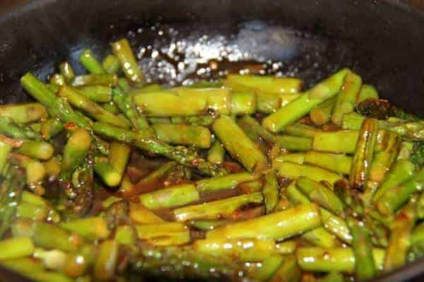 While the sauce was simmering I sautéed a bunch of asparagus to toss in with the chicken. It really adds nice color to the dish. If your family is anything like mine then you might have some picky eaters in the house! Just toss the asparagus with a bit of the sauce and leave it separate from the chicken.
