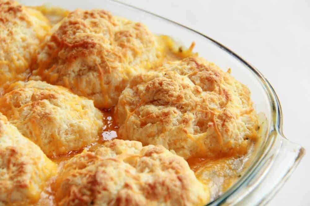 • Using two tablespoons, drop 6-8 mounds of dough onto the surface of the chicken and casserole mixture. Top with a generous amount of cheddar cheese.