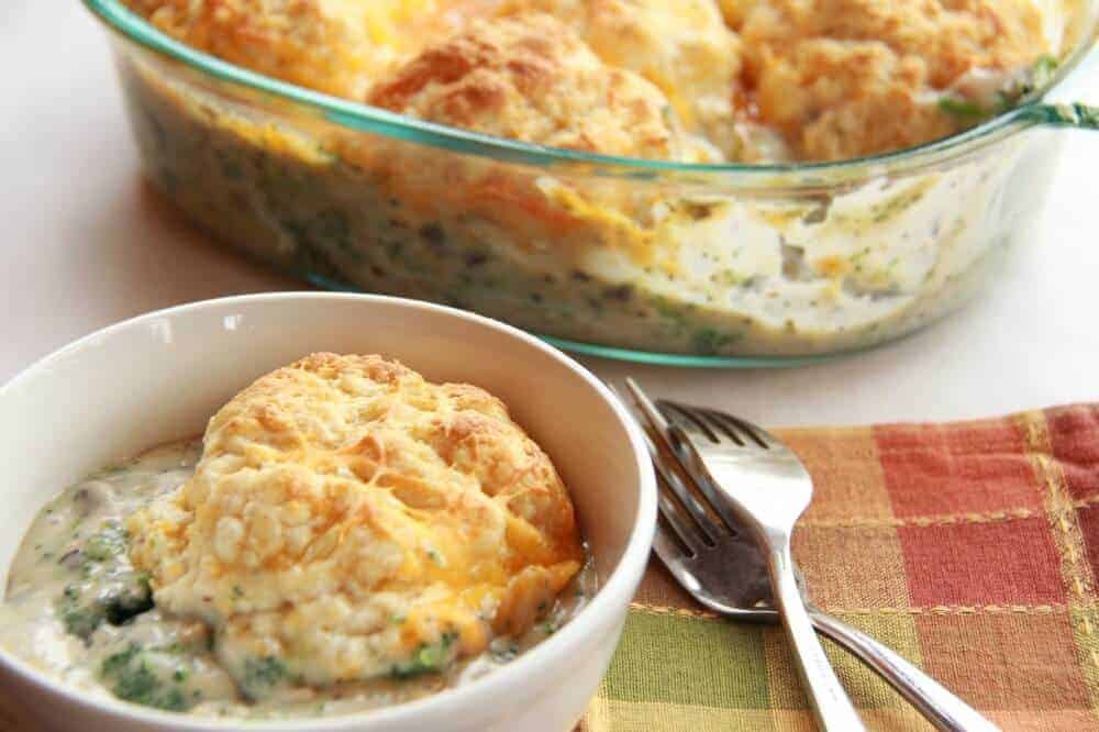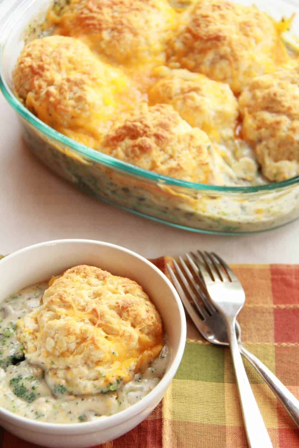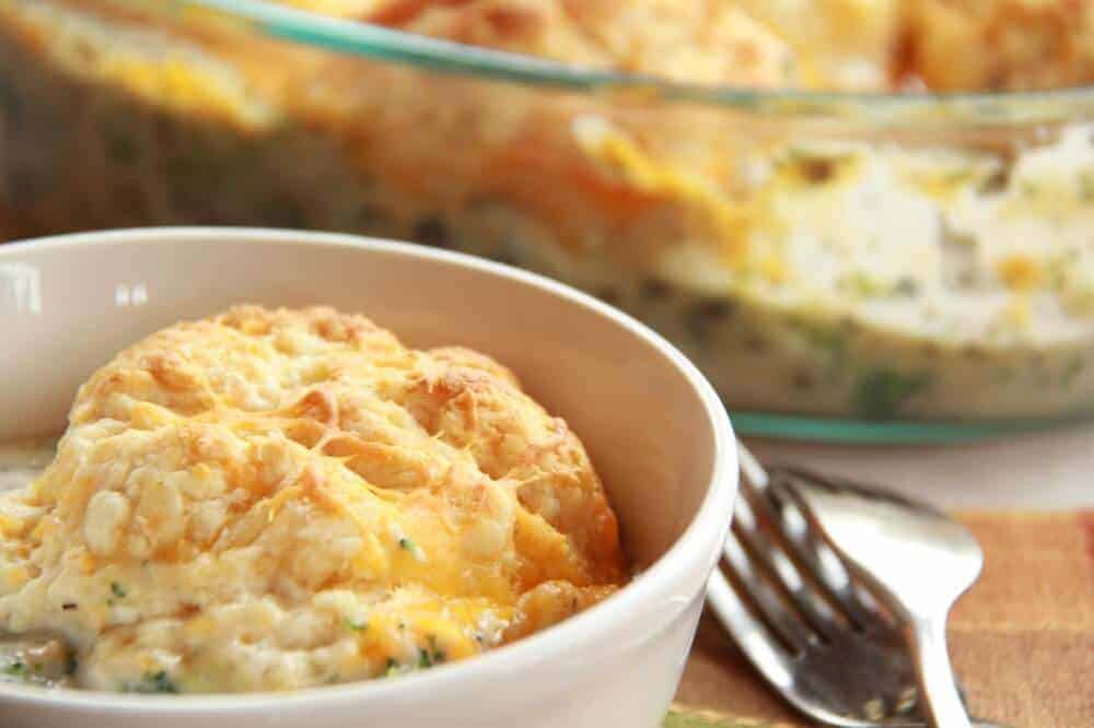 • Transfer the entire dish to the oven and bake for 40-45 minutes. You’ll know it’s ready when the biscuits are lightly golden brown and the center is bubbling. To serve, remove one of the biscuits, exposing the casserole filling. Spoon it out into a bowl and top with a biscuit. Repeat.