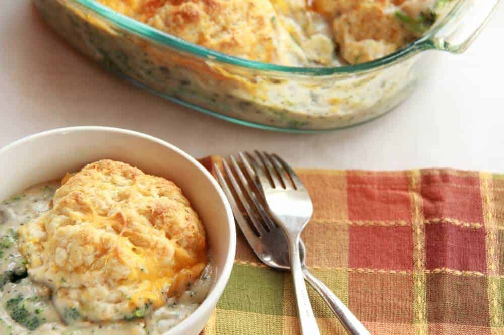 This savory cobbler is the perfect easy dinner to make you feel all warm and cozy! It’s a lot like broccoli cheddar soup, but thickened up a bit and topped with flakey cheddar cheese biscuits. Then top it off with more cheddar cheese!