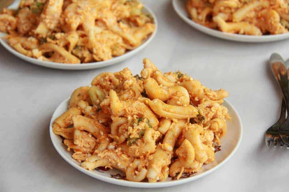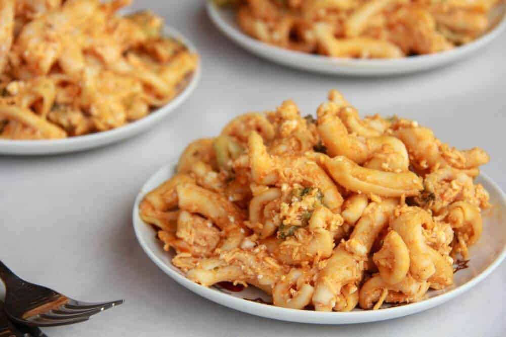 But it tastes good. Really good. Homemade buffalo sauce mixed with cheddar cheese and blue cheese to create a creamy and delicious alfredo-like sauce! One word. Yum.