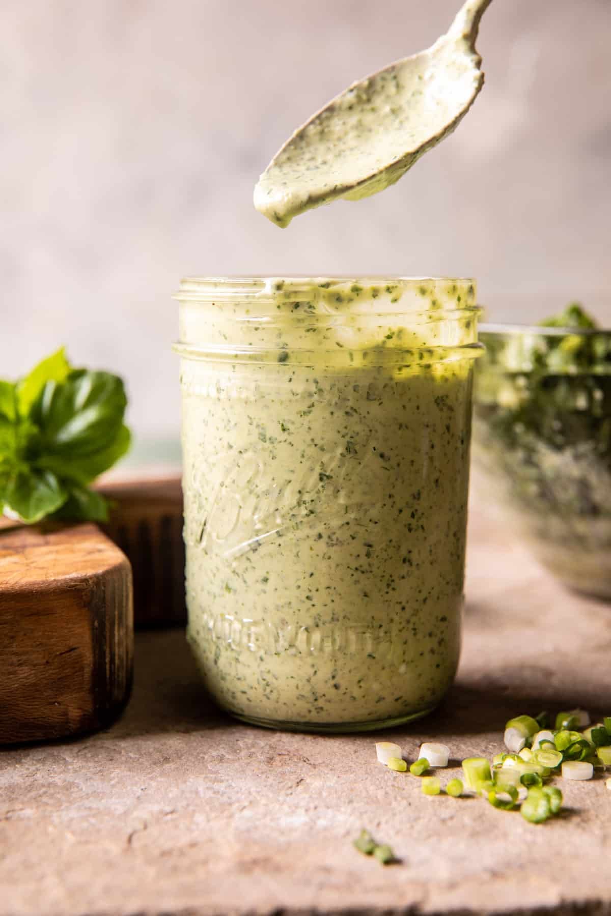 This is a creamy jalapeño ranch with yogurt, mayo, and lots of pickled jalapeños.  I blend everything up in a blender until creamy.