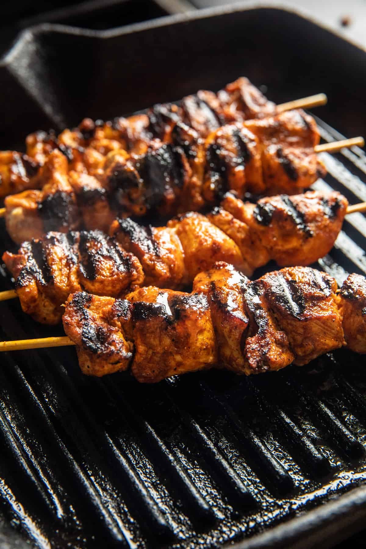 3. Set your grill, grill pan, or skillet to medium-high heat. Grill the skewers until lightly charred and cooked through, turning them occasionally throughout cooking, about 10 to 12 minutes total.