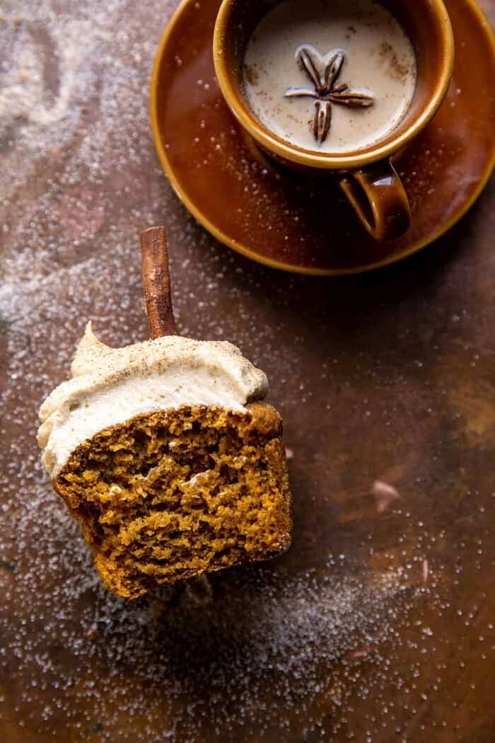 side angled photo Vanilla Chai Pumpkin Latte Cupcakes with Cinnamon Brown Sugar Frosting