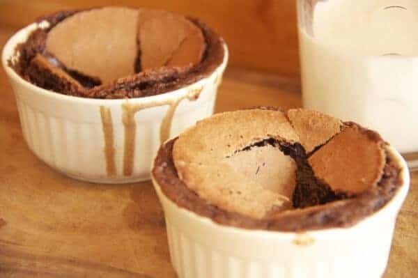 - Place one dark chocolate square in each ramekin.
