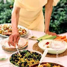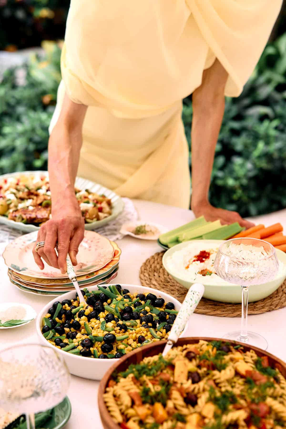 1. Heat a grill or broiler to high.2. Using a sharp knife, slice the kernels from 3 ears of the corn into a large bowl. Grill or broil the remaining 3 ears of corn until lightly charred all over, then remove and let cool just enough to handle. Slice the cooked corn kernels into the bowl with the raw corn.3. Scoop the avocado into a food processor or high-speed blender. Add 1 tablespoon of the olive oil, half the lime juice, and a pinch of salt. Puree until smooth. Add 2 tablespoons of the avocado puree to the bowl with the corn. Set the remainder aside.4. To the bowl with the corn, add the remaining 3 tablespoons of olive oil, the remaining lime juice, and the honey, chili powder, paprika, jalapeño, and chives. Toss well to mix evenly. Season with salt and pepper and toss once more. Stir in the coconut, basil, blueberries, and feta. Taste and adjust the seasonings as desired.5. Spoon the remaining avocado puree over the bottom of a serving bowl and top with the corn salad. Serve the salad as a side or with chips for scooping.
