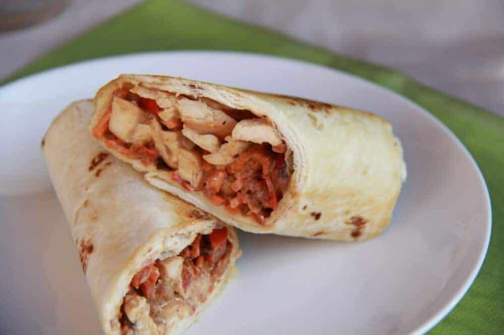 - Working with two tortillas at a time heat them in the microwave for 30 seconds. Add a good amount of the chicken and sauce to the top of one tortilla. Top with some veggies and then tuck in the sides and roll tightly. Repeat with remaining ingredients.