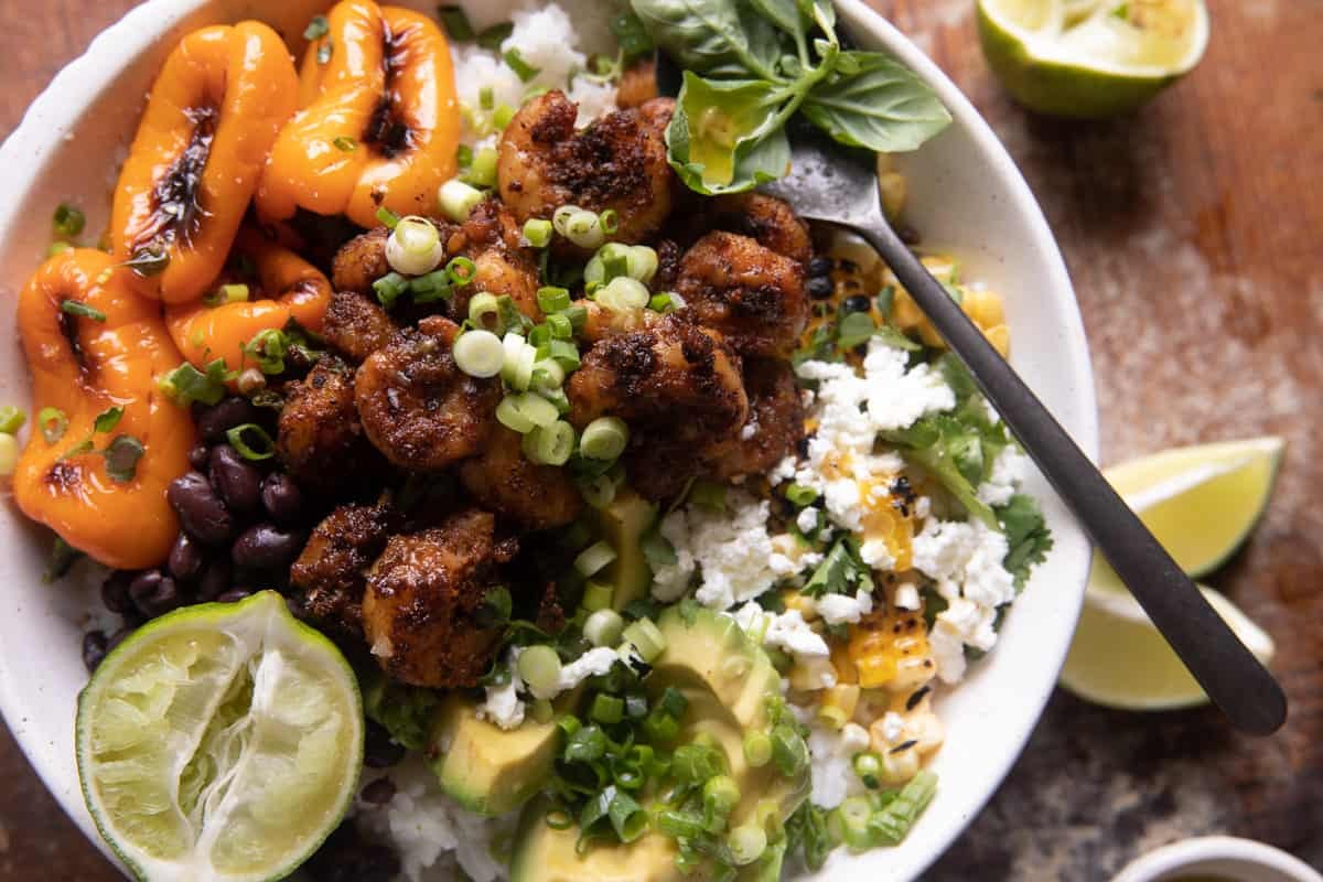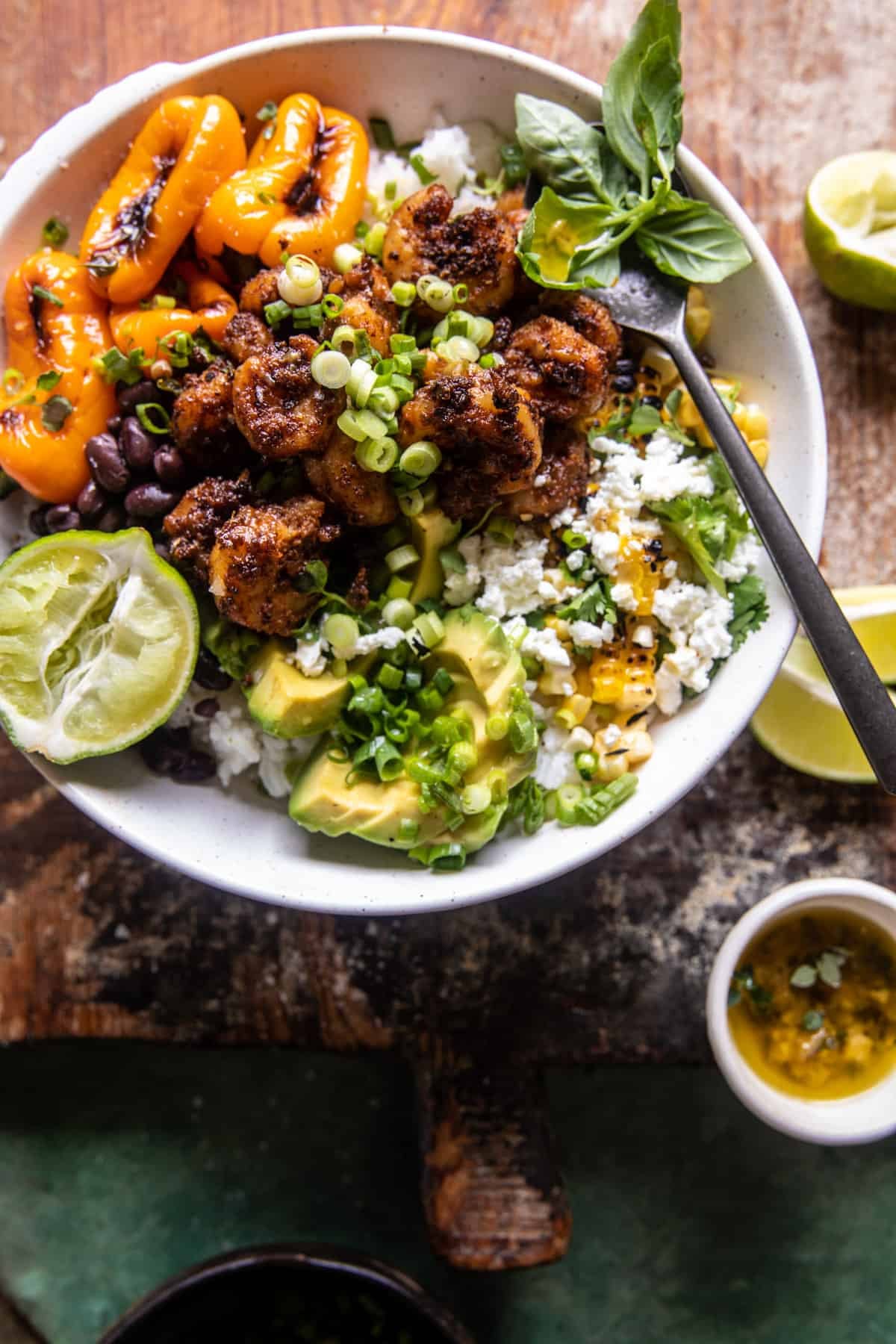 My new go-to weeknight dinner, 25 Minute Fajita Shrimp Rice Bowls. Spicy, garlic butter shrimp, pan-seared with bell peppers and onions, and served up bowl style with a cilantro-lime vinaigrette. All put together with rice, summer corn, salty cheese, and creamy avocado. These colorful and fresh shrimp fajita bowls are simple to make and full of wonderful Mexican flavors. A fun any night-of-the-week dinner!