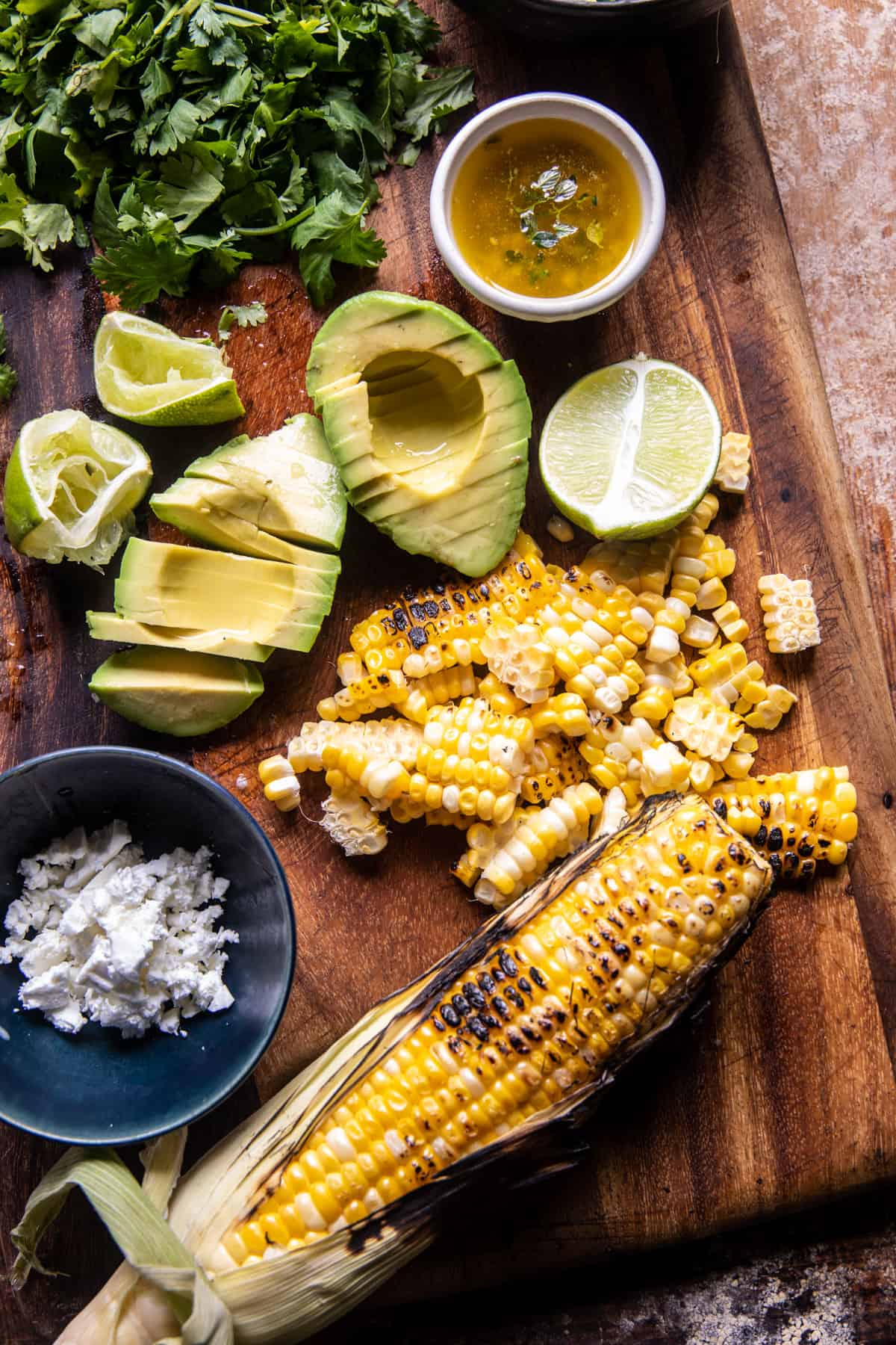 To complete each bowl layer your shrimp and peppers, then some fresh cooked rice, grilled corn, black beans, crumbled or shredded cheese, and then, chunks of avocado, green onions, and cilantro. Then top with the dressing.