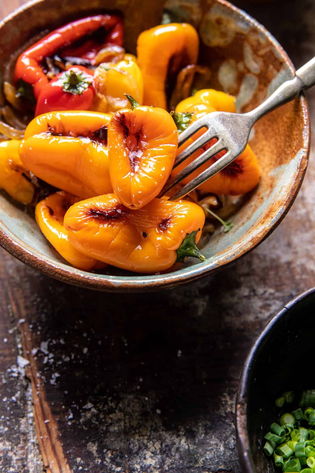 Cook the peppers. I love to use mini peppers if you have some on hand. They’re really delicious and pretty cute + fun too!