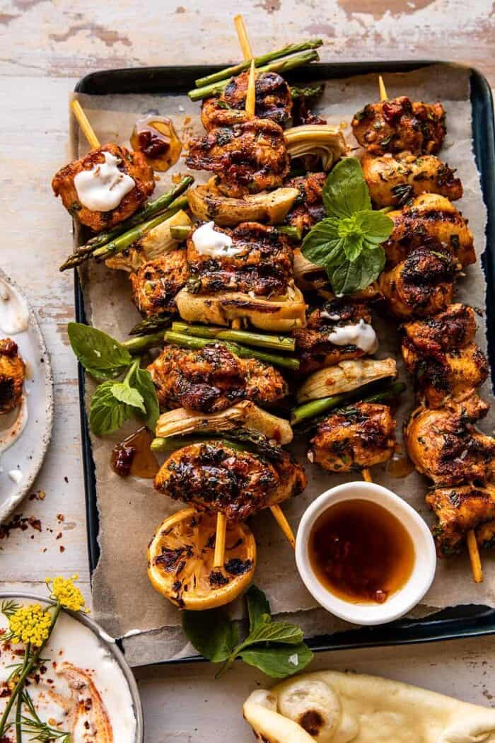 - 1. In a bowl, combine 3 tablespoons olive oil, the paprika, cumin, cayenne, cinnamon, 3 cloves garlic, ginger, cilantro, parsley, and a pinch each of chili flakes and salt. Add the chicken and toss to coat. Marinate for 15 minutes or up to overnight in the fridge.2. Meanwhile, make the vinaigrette. In a jar, combine 1/4 cup olive oil, the lemon juice, red wine vinegar, honey, sun-dried tomatoes, 1 clove garlic, and a pinch each of chili flakes, salt, and pepper. 3. To make the feta. Combine the feta, yogurt, and lemon juice in a blender or food processor. Blend until creamy. Stir in the herbs, paprika, and a pinch of red pepper flakes. 4. Set your grill, grill pan, or skillet to medium-high heat. Take skewers and thread the chicken, artichokes, and asparagus pieces on. Grill the skewers until lightly charred and cooked through, turning them occasionally throughout cooking, about 10 to 12 minutes total. Alternately, you can roast the chicken at 400 degrees for 20-30 minutes.6. Serve the chicken with the vinaigrette and feta sauce spooned over top. Top with fresh herbs and serve with naan and additional feta on the side.