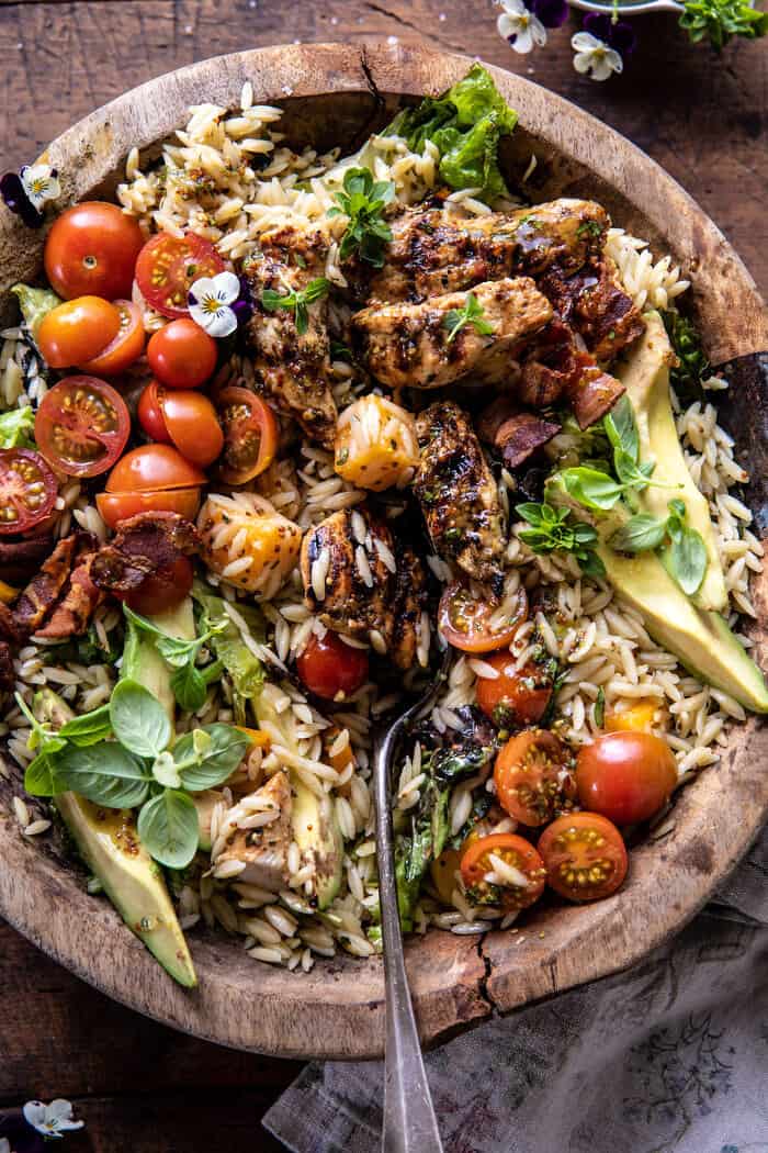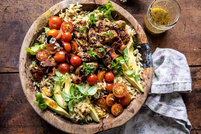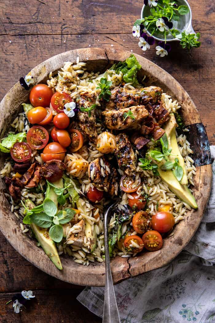 Grilled Lemon Herb Chicken Avocado Orzo Salad with Honey Mustard Bacon Dressing