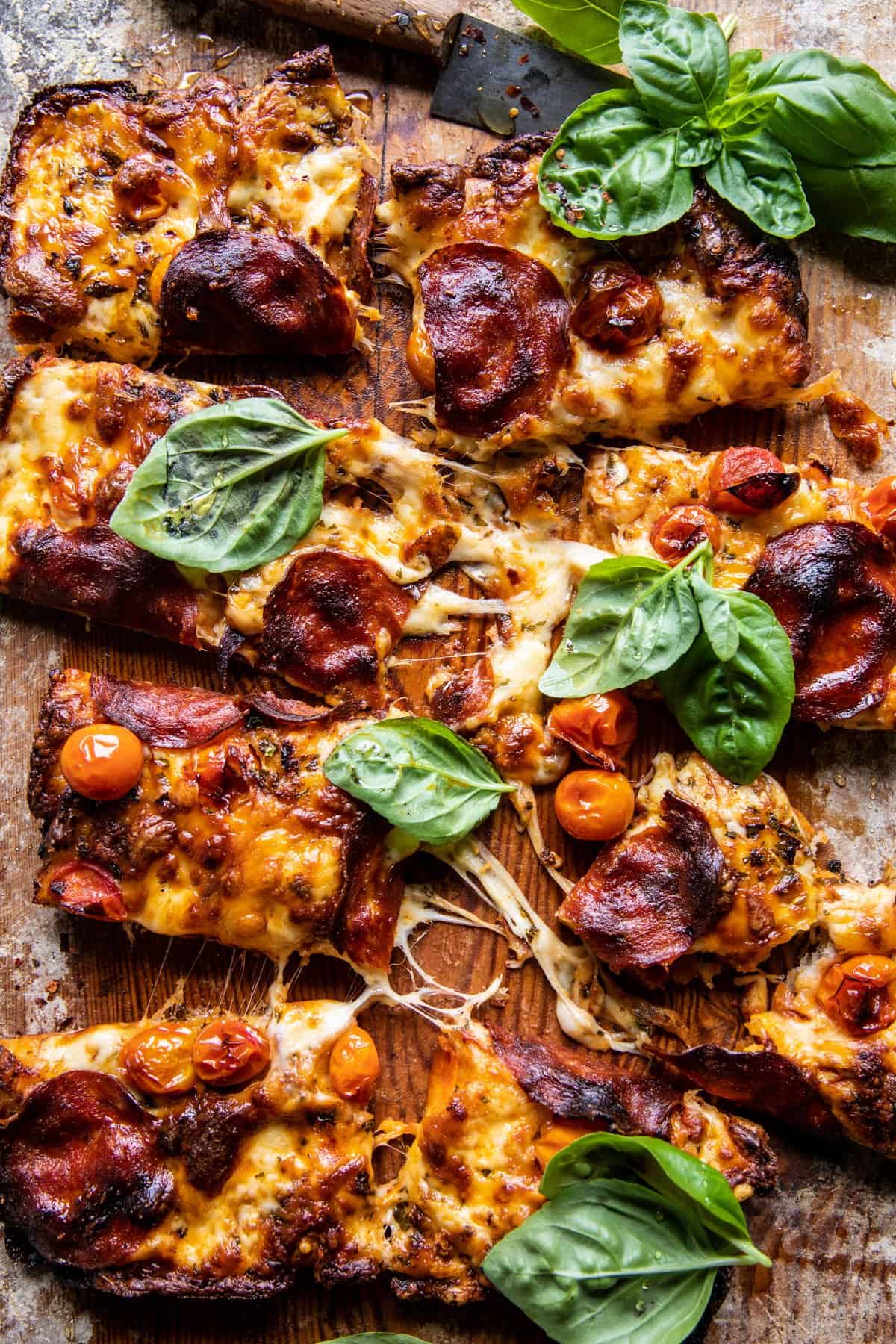 Thursday:ย Detroit Style Tomato Herb Pepperoni Pizza