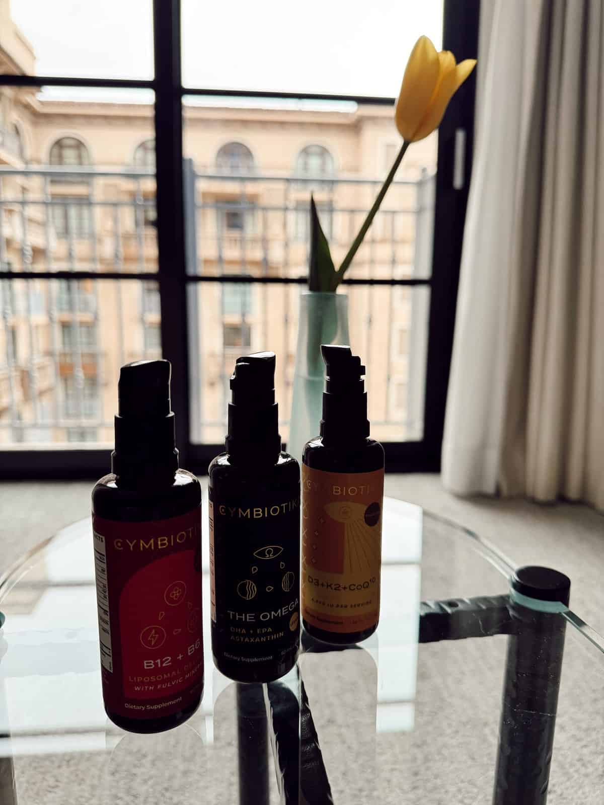 morning supplements, Cymbiotika The Omega, D3 + K2 + CoQ10, and B12 + B6