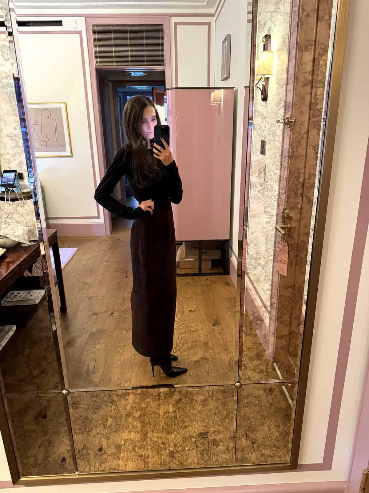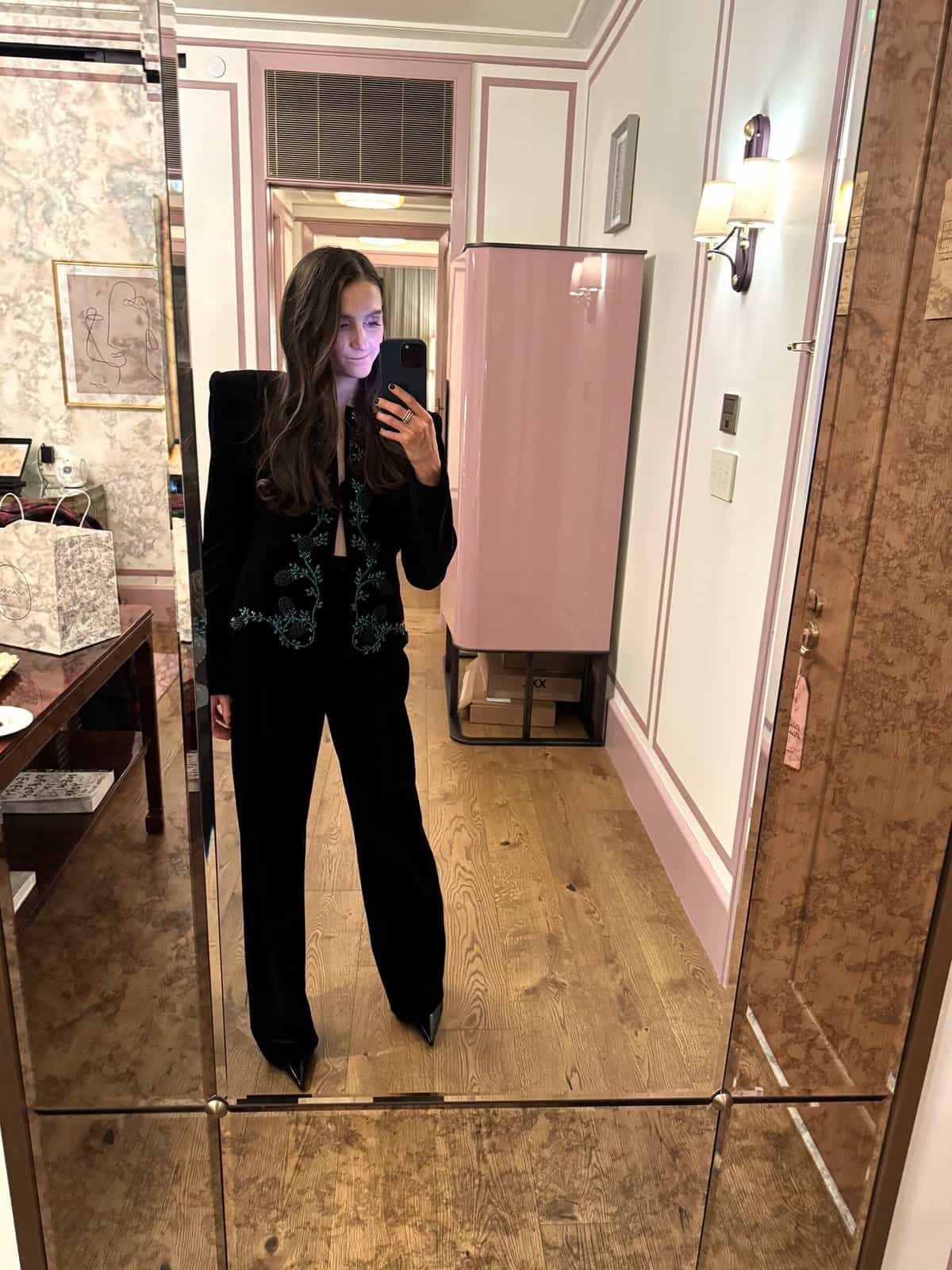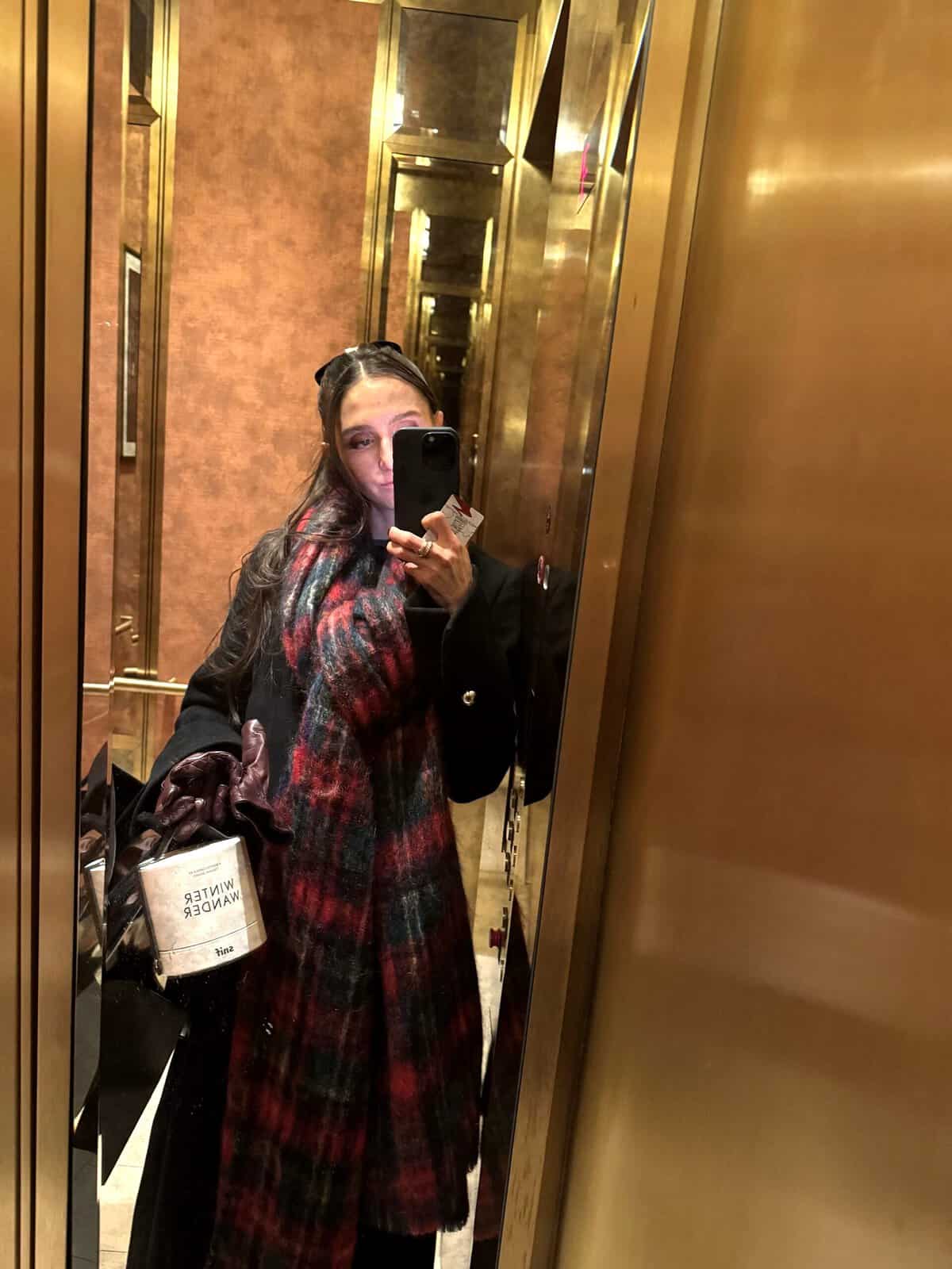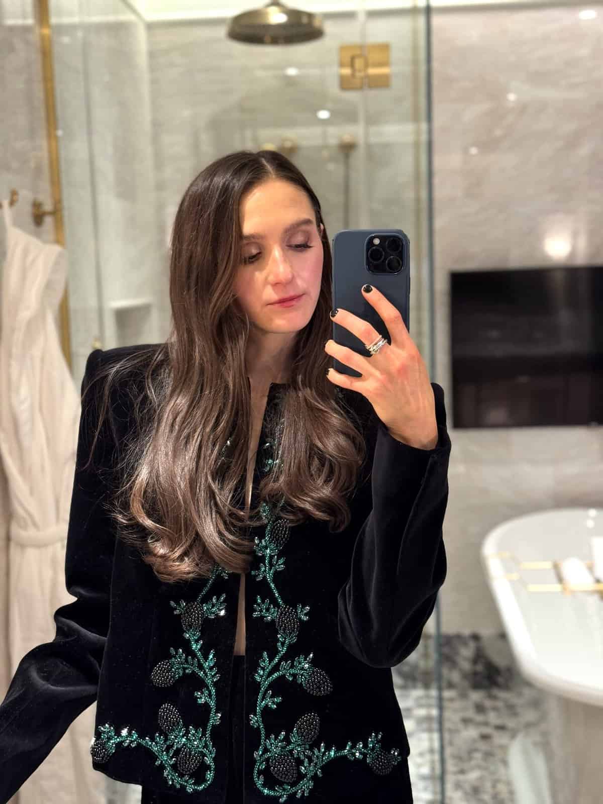 In the NYC photos, the black jacket with green trim is gorgeous! You look so beautiful in that outfit. Very festive!
