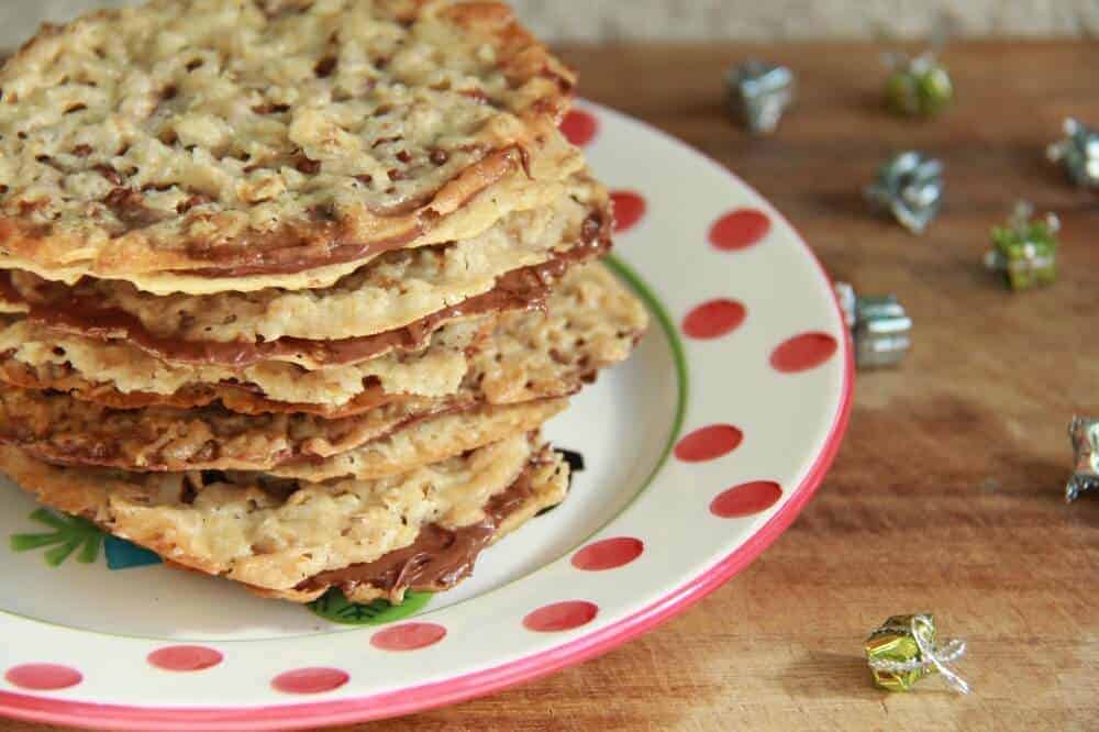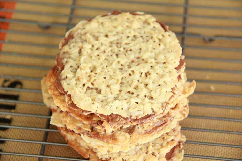 First up this season? Lace Cookies. But of course not just any old lace cookies. Nutella Stuffed Oatmeal Lace Cookies. I had never made lace cookies before yesterday and I have no idea why! They have a really nice mix of crunchy and creamy. I know that sounds odd, but it is the best way to describe them. Other than insanely addicting!