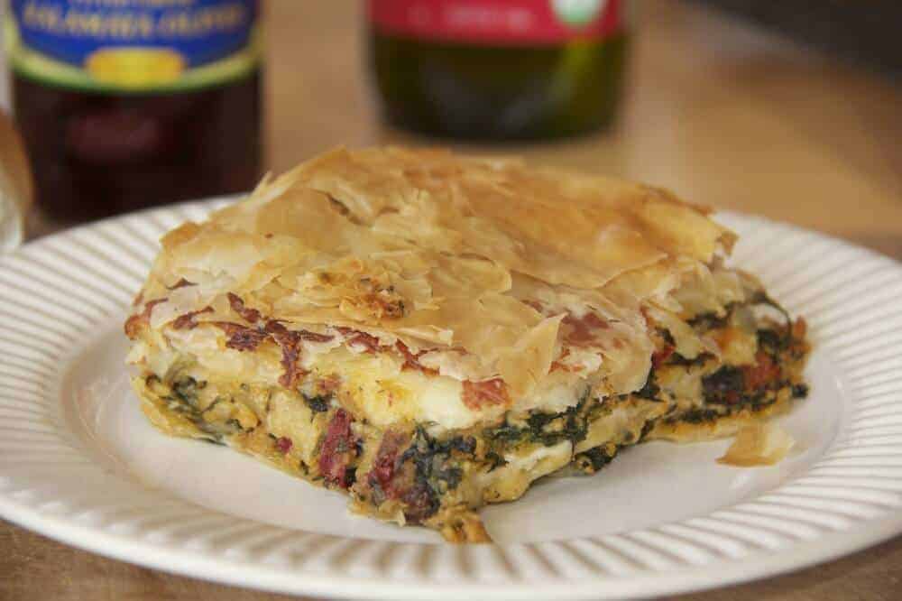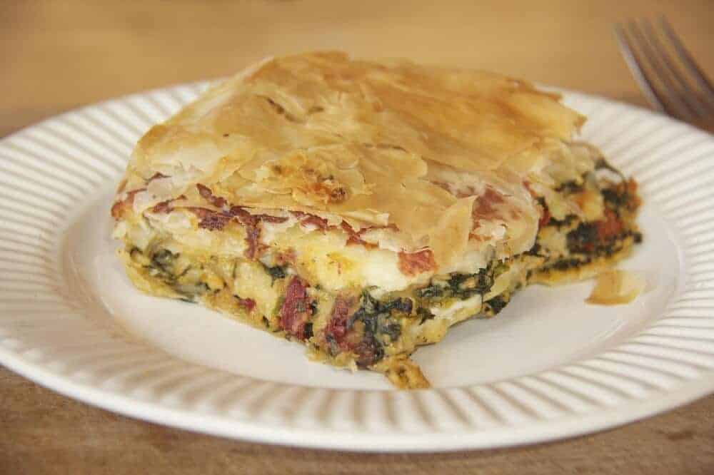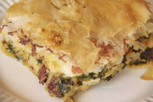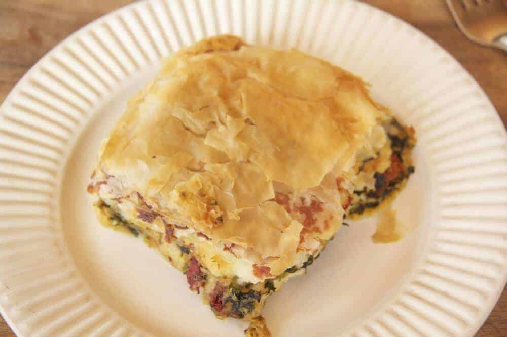 Made this last night. I’m not a huge fan of really strong Mediterranean flavors, but this was excellent. The flavor was enough to be enjoyably different from our usual fare, which is why I tried it. Mine was actually ready in about 55 minutes, so watch your cook times. I used melted butter for the dough, and I had to omit the red pepper flakes and switch to mild Italian sausage in hopes our little boys will try it today 🙂 but it is still full of flavor. My 8 year old really liked helping with the phyllo dough too (he was the “butter painter”). I know hubs will be asking for this to be made again and it would be excellent to bring to a potluck or to serve to guests, especially in a pretty baking dish, as the crust looks gorgeous (smells great too!).