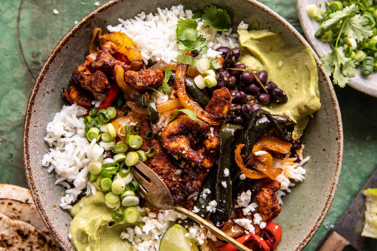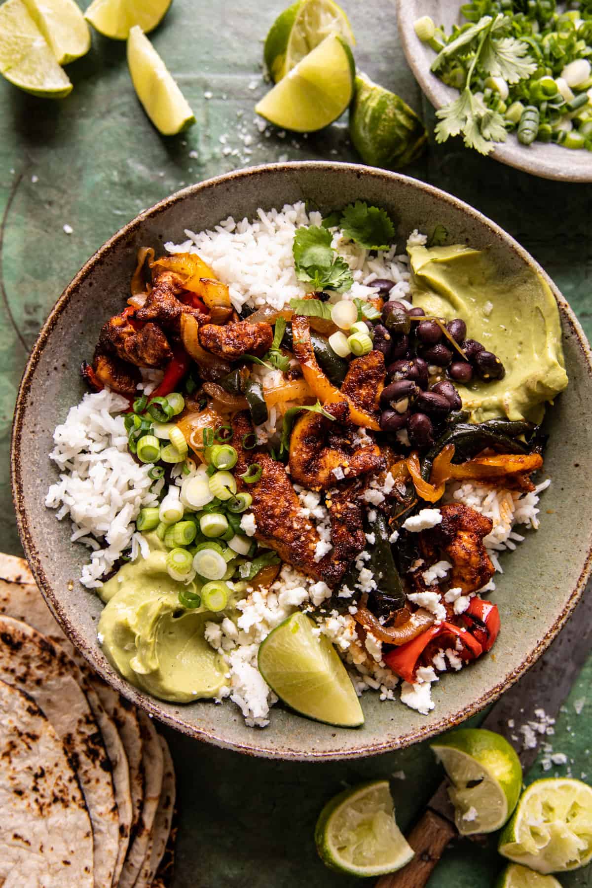 I serve the chicken, peppers, and onions over bowls of steamy white rice. Then add plenty of toppings. I warm the black beans first and then I dollop on an excessive amount of that salsa verde/guacamole. Next, add lots of cheese – pepper jack, cheddar, or cotija all work. And then fresh green onions, cilantro, lime zest, sour cream, and lime juice.