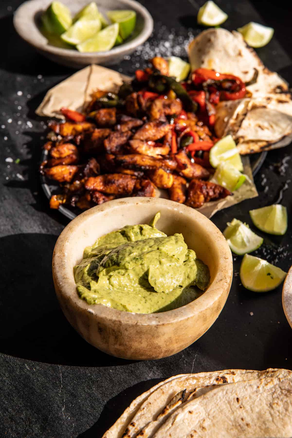 Avocados mixed with my favorite store-bought salsa verde, then lots of lime. I’ll usually add extra cilantro too, plus sea salt. If you want to be a little fancier, you can whip it all together in a food processor. Either way, it’s a very yummy guacamole.