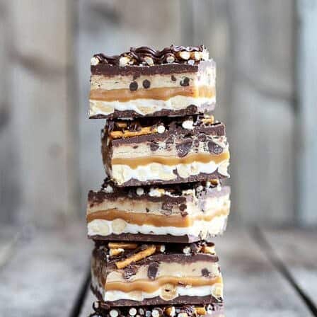 Buzzfeed โ 15 Times Pretzels and Chocolate Were a Perfect Pairing โ Salted Pretzel Chocolate Chip Cookie Dough Snickers Bars