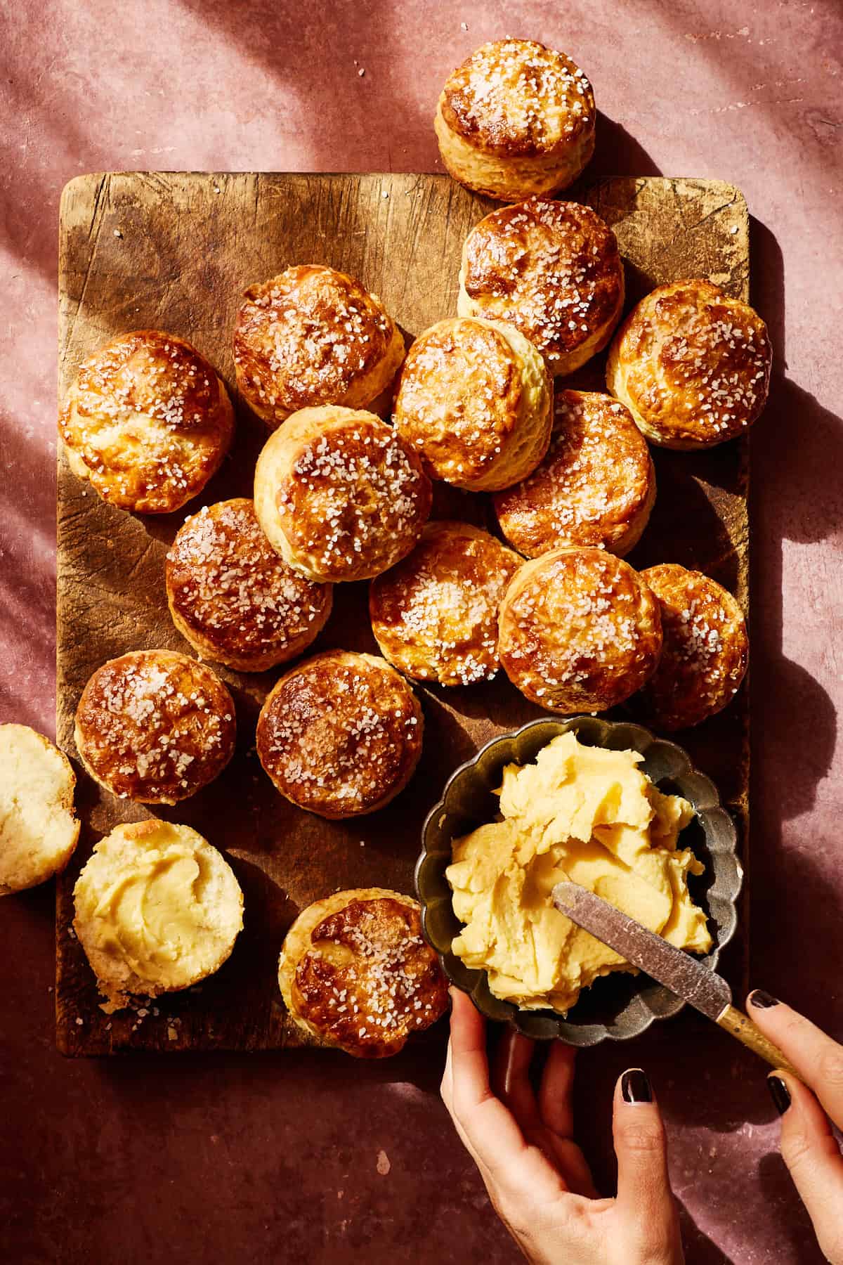 When I was creating this year’s Thanksgiving menu, I thought about all the rolls, popovers, and breads I’ve baked in the past. But something I’d never thought to do before was combine two of my mom’s favorites: flaky homemade biscuits and soft, salty pretzels.