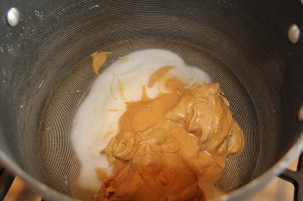 - Mix Karo syrup, peanut butter and sugar all together in large saucepan