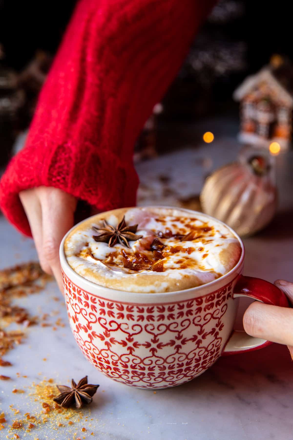 The caramel brûlée is literally just caramelized sugar that you break into pieces. SO SIMPLE, but yet so good – and festive! Just sprinkle the shards of sugar over the latte. They melt into the drink creating the most delicious caramel swirls in your gingerbread.